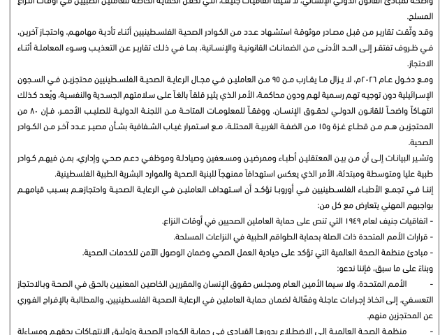 بيان صحفي – حماية العاملين في الرعاية الصحية في فلسطين واجب قانوني وأخلاقي دولي
