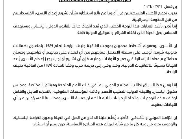 بيان صادر عن تجمع الأطباء الفلسطينيين في أوروبا حول تشريع إعدام الأسرى الفلسطينيين